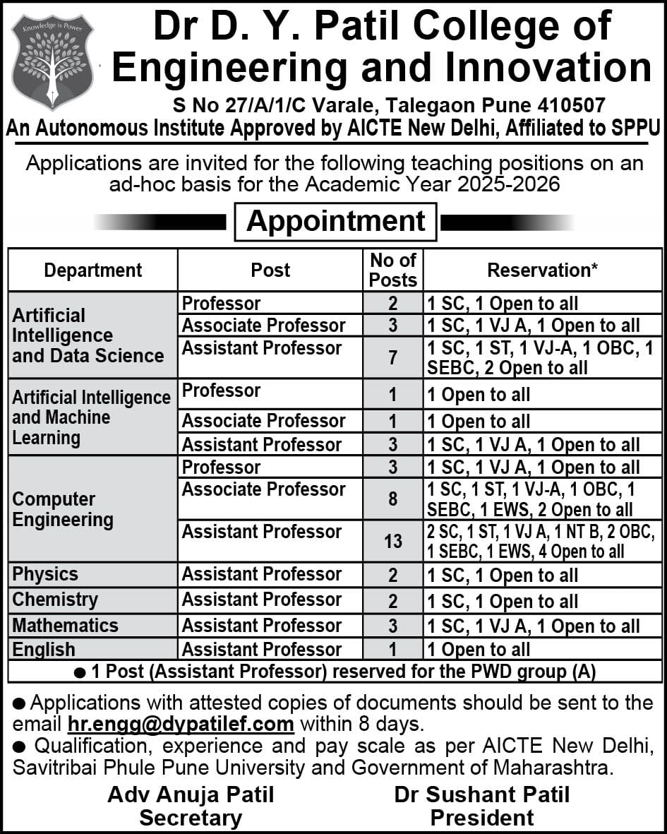 Applications with attested copies of documents should be sent to the email “hr.engg@dypatilef.com” within 8 days.