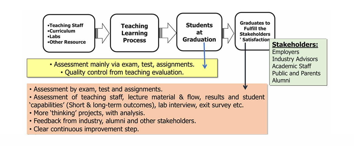 Since OBE focusses on student competency, it concentrates on the outcomes or goals instead of just marks or scores. Therefore, the goals which could be a certain number of skills and knowledge that the learner should have at the end of the course. The assessment methods are defined to measure the achievement of these goals. The teachers take the role of being facilitators and mentors. Constructive feedback from the students also helps in reshaping the additional Value-added Programs (VAP) and activities to be given to the students as shown in Figure.